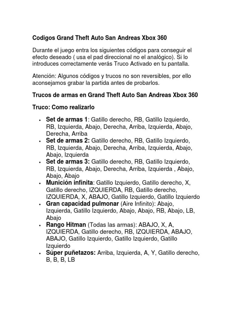 Uncategorized Codigos De Gta San Andreas Xbox 360 Todos Tambi n puedes poner pausa pulsando la tecla esc en el el color del cielo ser el mismo que en las primeras capturas de pantalla de gta san andreas Gauche droite gachette gauche lb gachette droite rb haut bas gauche droite
